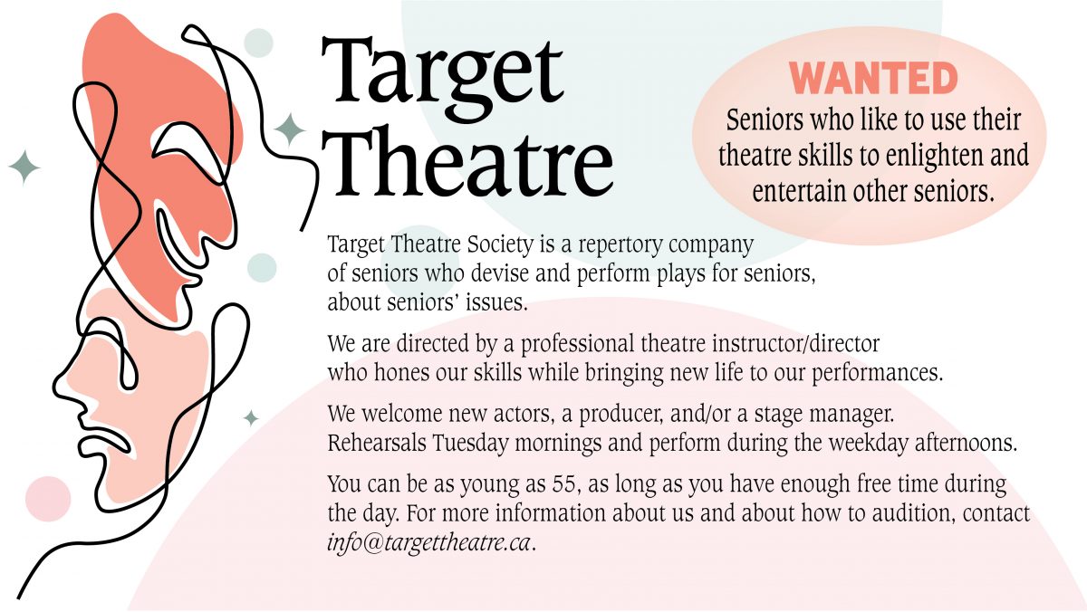 Target Theatre, a non-profit organization of seniors (55+) is auditioning for people for women’s and men’s roles in a couple of our plays. We are dedicated to showcasing seniors’ issues and think that the best way to do this is by having seniors themselves perform these plays.